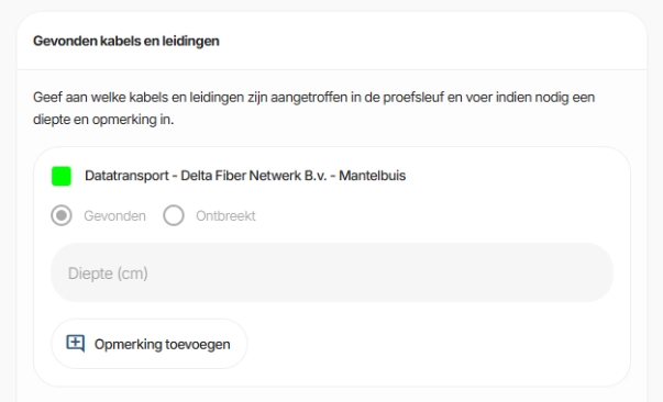 We hebben de manier verbeterd waarop je een proefsleuf in Mister KLIC kunt registreren. Bij het aanmaken van een proefsleuf moet je nu altijd een lijn tekenen. Wij controleren vervolgens welke kabels of leidingen er in de KLIC-melding onder deze lijn liggen en geven de resultaten weer in een lijst. De persoon die de proefsleuf registreert hoeft alleen nog voor elke kabel of leiding in deze lijst aan te geven of hij of zij deze in de proefsleuf is tegengekomen, en zo ja, hoe diep de kabel of leiding ligt. Ook moet er een foto worden toegevoegd. Als er een kabel of leiding gevonden wordt die niet in de KLIC-melding staat, dan kan de gebruiker deze handmatig toevoegen.