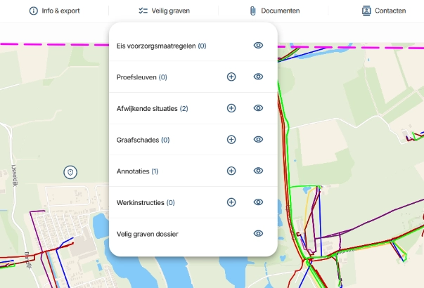 Het nieuwe Veilig graven menu, dat je kunt openen door in een KLIC-melding op de knop Veilig graven te klikken, toont alle onderdelen van het Veilig graven overzichtelijk onder elkaar: eis voorzorgsmaatregelen, proefsleuven, afwijkende situaties, graafschades, annotaties, werkinstructies en het veilig graven dossier. Achter elk van deze onderdelen staat een tellertje dat toont hoeveel van deze onderdelen er in deze KLIC-melding aanwezig zijn. Door op een onderdeel in de lijst te klikken ga je naar een pagina met daarop een lijst van de geregistreerde zaken. Door op het plusje te klikken kun je direct een nieuwe proefsleuf, afwijkende situatie, graafschade, annotatie of werkinstructie toevoegen op de kaart.