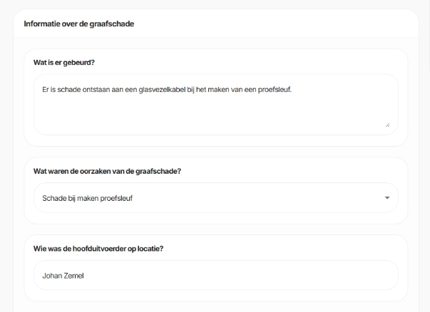 Dankzij de input van onze gebruikers hebben we de registratie van graafschade in Mister KLIC dusdanig uitgebreid dat je alle voor een verzekeraar relevante informatie direct na het constateren van de schade kunt registreren. Door ook nog één of meerdere foto's toe te voegen vergroot je de kans op een succesvolle afhandeling van je schadeclaim.